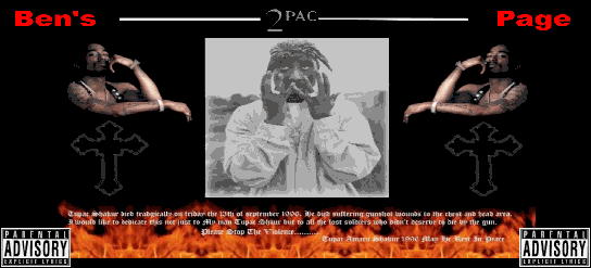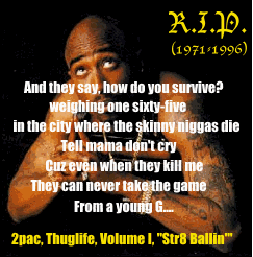 Welcome everyone to my best 2pac Tribute Page yet, First off I would just like to say thank You for coming to my page and I hope you come back. At this point in time I have not got an Mp3 section because ummm I don't know why but I don't so bare with me I am working on it. If you have anything about Tupac that is interesting send it to me and I will put it on my page ok!!. In this page I have lyrics, poems, Interviews, And lots and lots of Pictures. I also have a time line in here as well so take a peep if you have time ok. Well last of all I want to say hello to Ashley, Ben, Aymyn, Jim, Evan, Brad, Aaron, Narmz, Jo, Sam. M, Miki, and everyone else Hi. Bye Ben AKA Thugs.